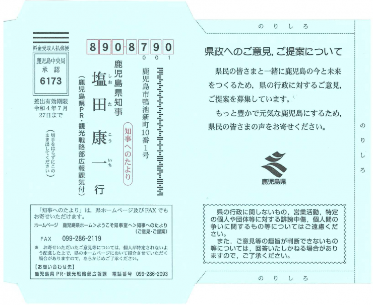 - 鹿児島を良くしたいとの思いで、県民の皆様からお伺いしたご意見が、担当課を通して県政に反映されること。