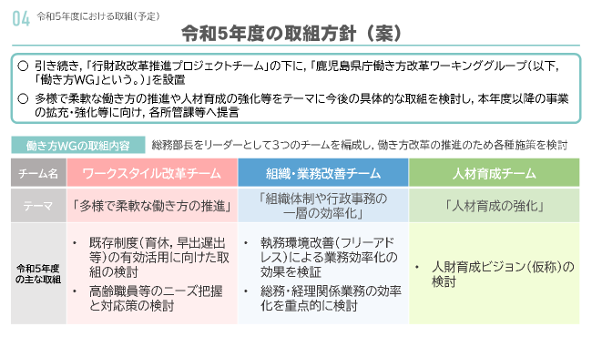鹿児島県庁がよりよい行政サービスを提供できる組織であるために、組織機構の管理や、業務改革の推進、職員の人材育成などを通して、持続可能な組織体制づくりをすることです。