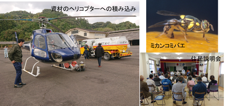 海外から侵入した農作物の害虫ミカンコミバエを駆除するため、住民への説明や駆除資材をヘリコプターに積み込む様子