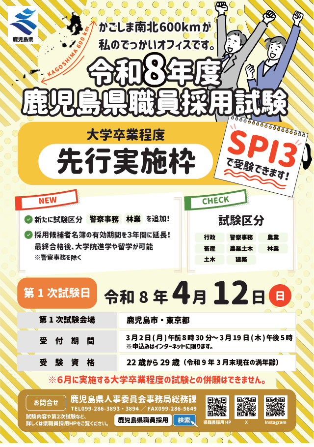 本日(2月27日(金))から、令和8年度鹿児島県職員採用試験(大学卒業程度)「先行実施枠」の試験案内の配布がスタートしました!