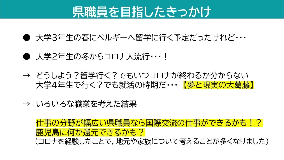 - 県職員の魅力や試験概要、福利厚生などについて詳しく知ることができ非常に分かりやすかった。改めて県職員として働きたいと思い、来年の試験に向けて頑張りたい。