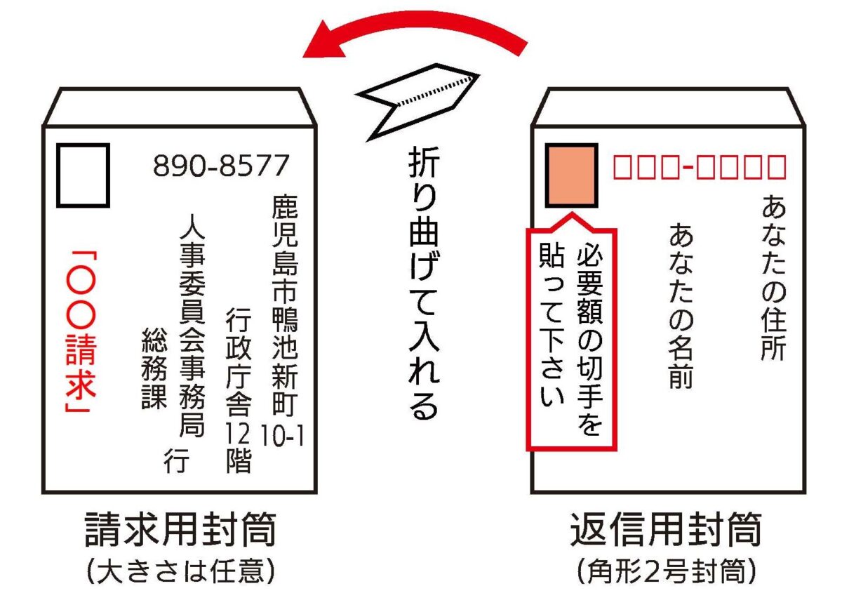 封筒の表に受験希望の試験名を「○○試験案内請求」と記入(総合案内も希望する場合はその旨も明記)の上、必要額の切手を貼った宛先明記の返信用封筒【角形2号封筒(A4版)】を同封して、人事委員会事務局あてに送付してください。