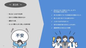 - 転勤について,心配や不安を抱えていたため,今回参加して安心に繋がった。